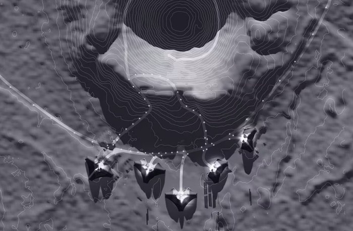 LINA (Lunar Infrastructure Asset), demikian pangkalan itu disebut, akan dibangun oleh robot otonom di dekat kawah Shackleton, di mana sinar Matahari yang hampir terus-menerus di puncak dapat memungkinkan sumber daya dari tenaga surya. Tidak hanya itu, bayangan konstan di bagian dalam kawah juga memungkinkan pengambilan es air.Β Foto: AI SpaceFactory