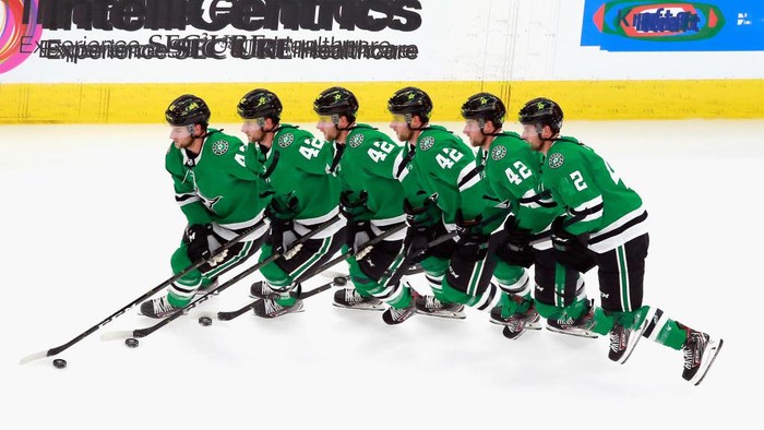 Sebanyak 7 bayangan tercipta lewat teknik multiple exposure saat seorang pemain hockey meluncur di atas es.
