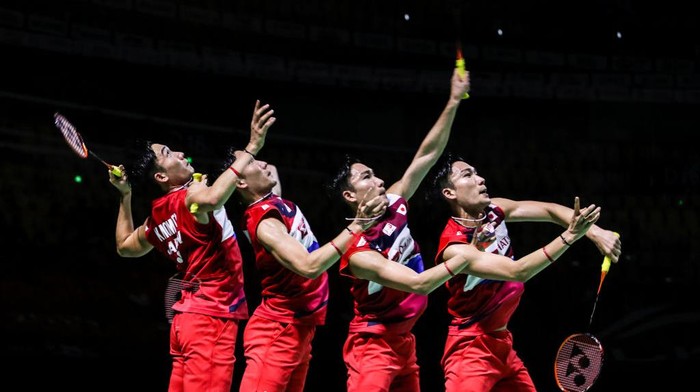 Pebulutangkis asal Jepang, Kento Momota, terlihat melakukan smash keras. Detail tiap gerakannya terungkap lewat jepretan multiple exposure.