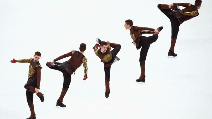 Seorang atlet figure skating unjuk kebolehan di atas es.