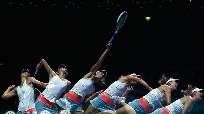 Maria Sharapova saat melalukan servis terlihat sangat sempurna.