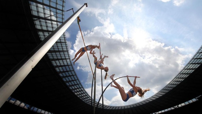 Pertama ada seorang atlet yang melakukan lompat galah. Dalam aksinya tersebut sang atlet terlihat membelah diri menjadi tiga tubuh lho.