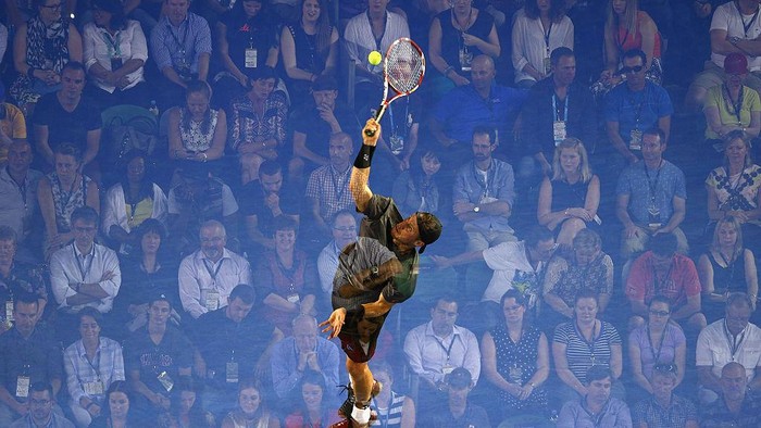 Petenis Lleyton Hewitt melakukan servis dengan latar belakang tribun penonton yang ciamik.