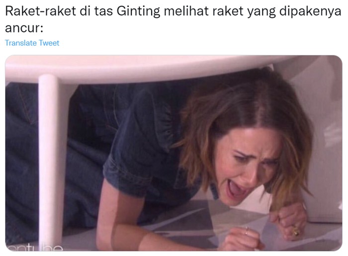 Banyak netizen terharu ketika Ginting membanting raket. Sudah lama Ginting tidak meraih juara. Meme Jerry terharu pun dipakai fans. Foto: Twitter