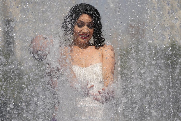 Warga di kota London mencelupkan kepala ke kolam untuk sekadar meredakan paparan suhu panas. Termometer mencatat suhu di area Coningsby mencapai 40,3 derajat Celcius. Sedangkan 33 wilayah lainnya melewati rekor sugu tertinggi sebelumnya, yaitu 38,7 derajat Celcius di tahun 2019. Foto: Associated Press