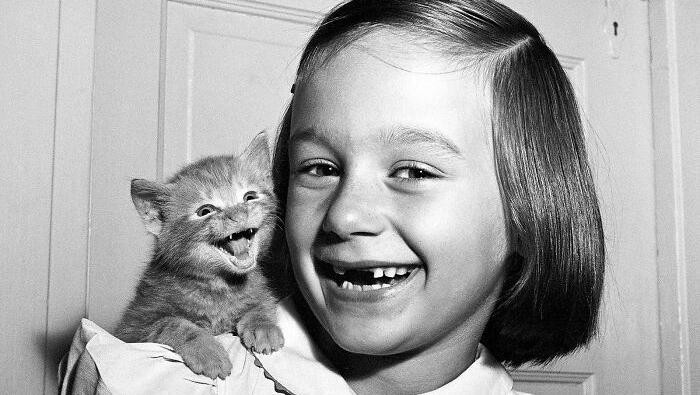 Siapa yang mengira kalo anak kucing tersebut senyum? ternyata kucing tersebut sedang mengeong di pundakΒ anak kecil yang bernama Paula dan kemudian diabadikan oleh Walter Chandoha pada tahun 1955. Bisa kebetulan gitu yaa...Foto: Facebook