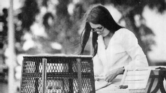 Ibu menggunakan tempat sampah untuk menggendong bayinya saatΒ dia sedangΒ merajut di Taman pada 1969. Tampak kasihan ya bayinya tapi tetap gemes lihatnya.Β Foto: Facebook