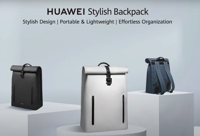 Tak ketinggalan, Huawei menampilkan backpack stylish terbaru mereka, tersedia dalam tiga pilihan warna hitam, putih dan biru. Foto: Huawei