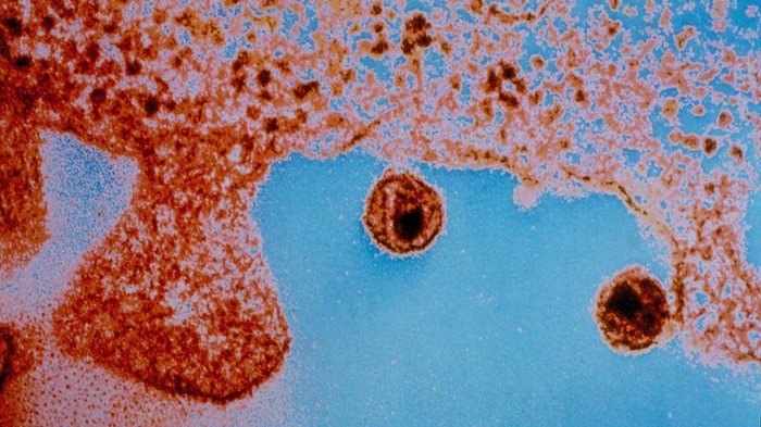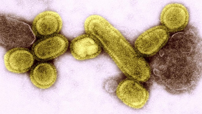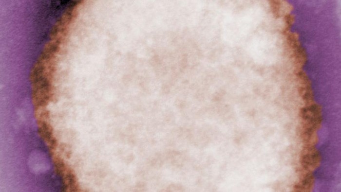 Pertama, ada gambar mikroskopis dari partikel virus cacar monyet.