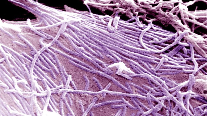 Lanjut, ada virus Ebola yang gambarnya dihasilkan dari pemindaian mikrograf elektron.