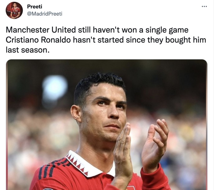 MU belum pernah sekalipun menang jika Ronaldo tak diturunkan sebagai starter. Foto: Twitter