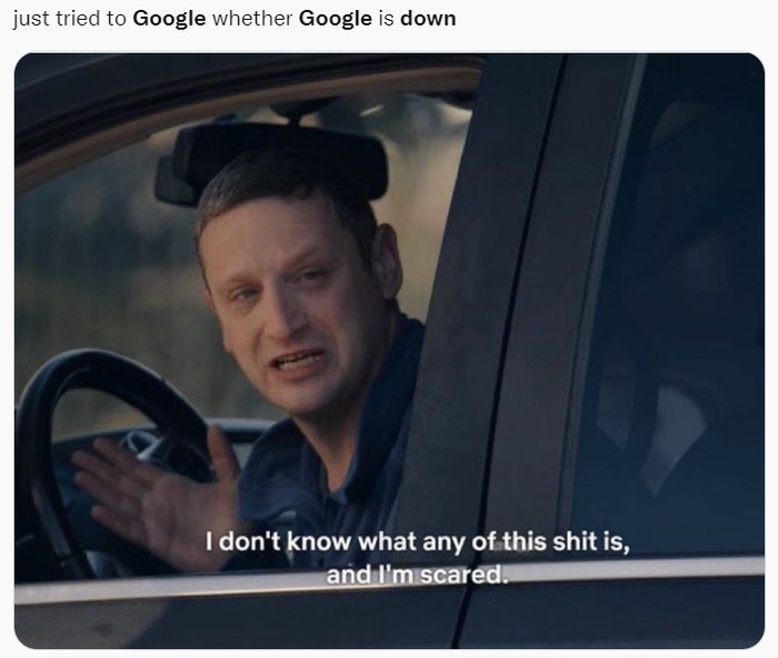 Google down, perasaan kamu jadi takut nggak seperti meme ini? Foto: (Twitter)