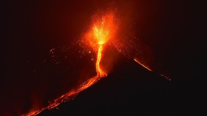 Selanjutnya ada lelehan lava dari Gunung Etna di Pulau Sisilia, Italia, pada Desember 2015. Gunung berapi di Mediterania tersebut mengeluarkan kolom abu setinggi tujuh kilometer. (Giovanno Isolino/AFP/Getty Images)