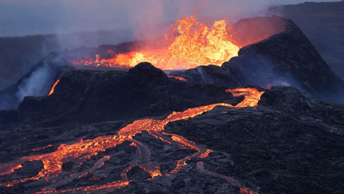 Jika dilihat dari dekat seperti inilah lelehan lava. Lelehan ini terjadi di Gunung Fargradalsfjall, Islandia. Momen ini terjadi pada 19 Agustus 2021 lalu. (Halldor Kolbeins/AFP/Getty Images)