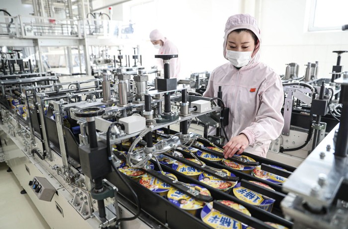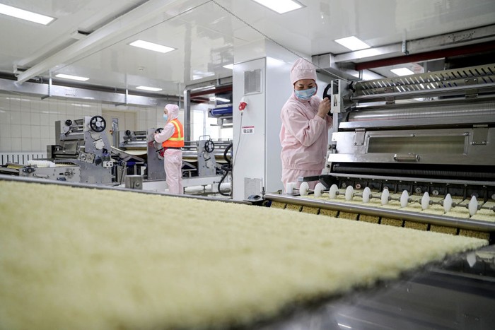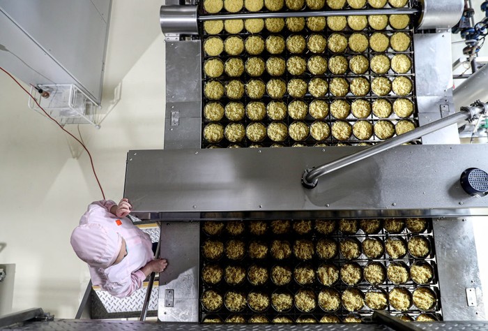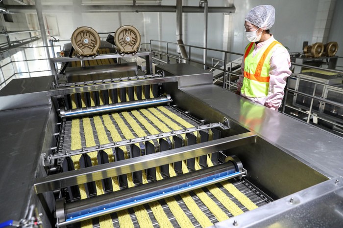 Petugas mengawasi mie instan agar sesuai dengan kualitas yang ditentukan. Foto: Getty Images