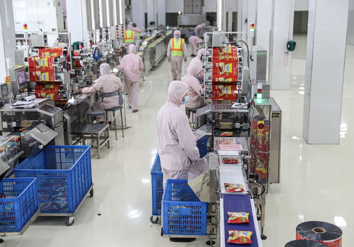 Mie instan yang sudah jadi akan dilengkapi dengan bumbu dan kemudian dibungkus oleh mesin. Foto: Getty Images