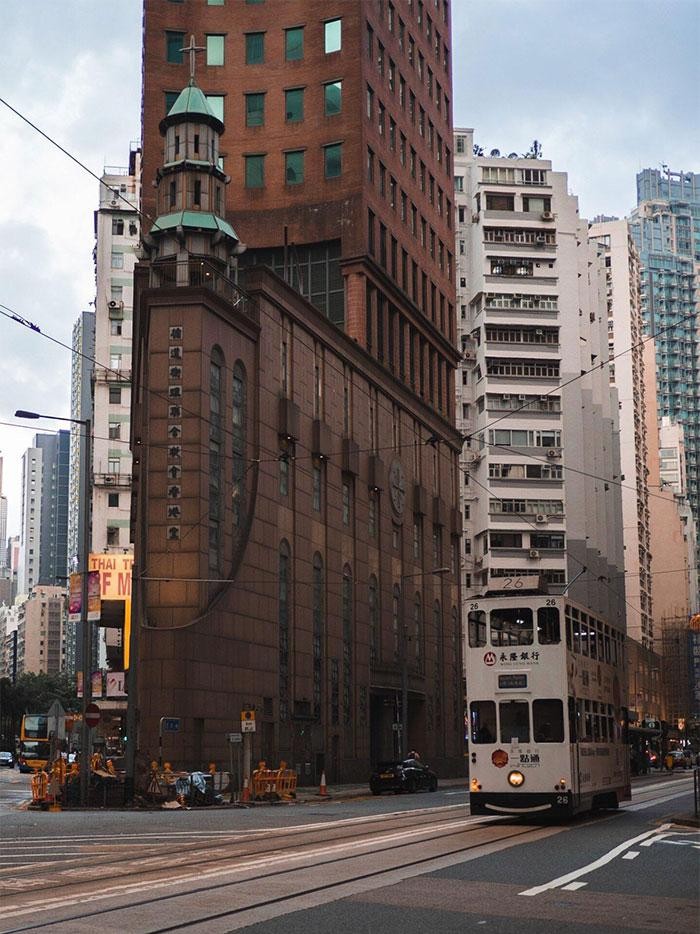 Kereta tram yang warnanya persis dengan gedung di belakangnya.