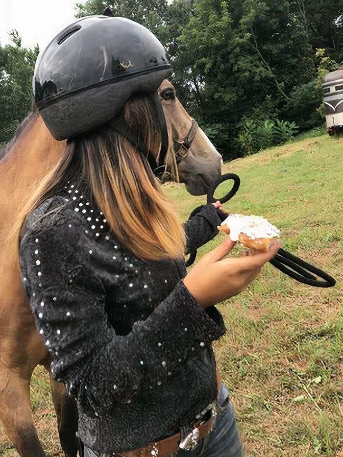 Bukan kuda pakai helm, tapi wanita berhelm berdiri di samping kuda.