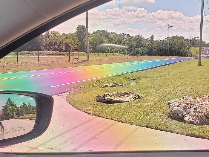 Itu adalah pantulan cahaya di kaca, bukan jalan yang dicat pelangi.