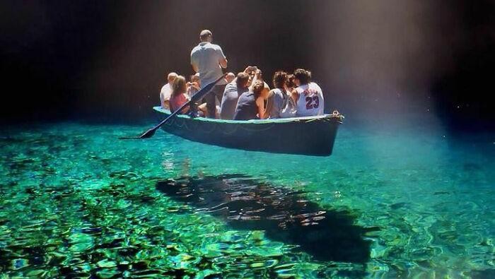 Perahu yang seolah-olah melayang, padahal mengapung di atas air yang bening.