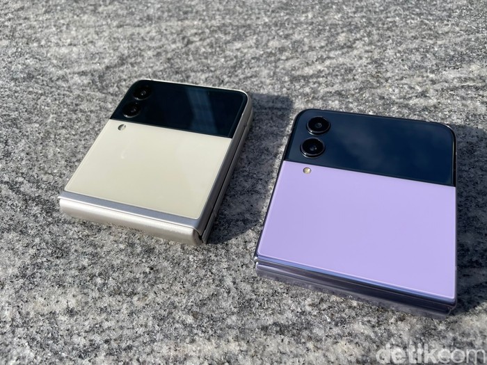 Ini Galaxy Z Flip 3 (kuning) dan Z Flip 4 (ungu). Foto: Agus Tri Haryanto/detikINET