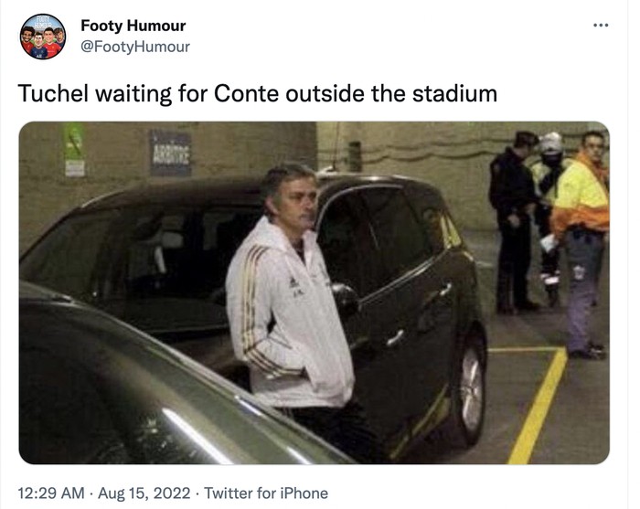 Penampakan Tuchel menunggu Conte untuk melanjutkan duel di luar stadion. Foto: Twitter