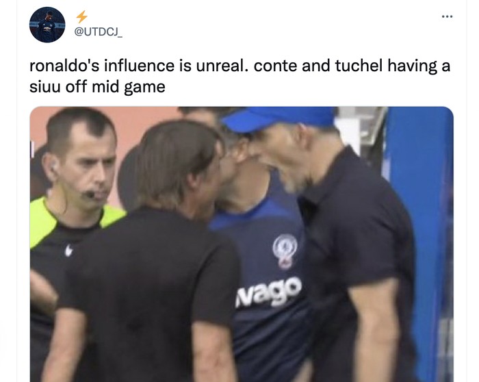 Thomas Tuchel dan Antonio Conte seperti sedang mengucapkan 'siuuu' ala Cristiano Ronaldo. Foto: Twitter