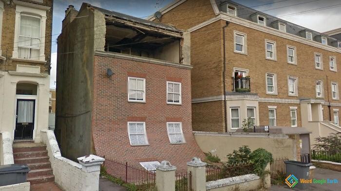 Dinding rumah yang merosot di Margate, Inggris.
