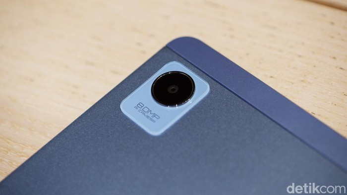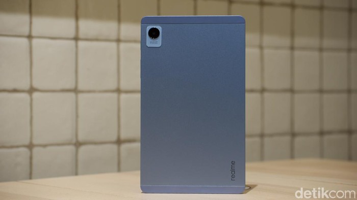 Cover belakangnya menggunakan material aluminium alloy memberikan kesan premium. Realme Pad Mini tampil dengan bodi ramping dan ringan. Ketebalannya hanya 7,6 milimeter, sementara beratnya hanya 372 gram. Foto: Adi Fida Rahman/detikINET
