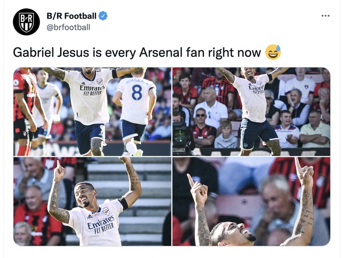 Perayaan Gabriel Jesus yang juga terus tampil impresif mewakili kegembiraan para fans Arsenal. Foto: Twitter