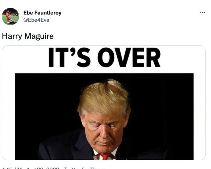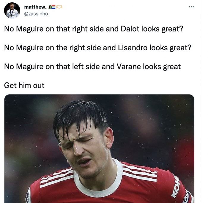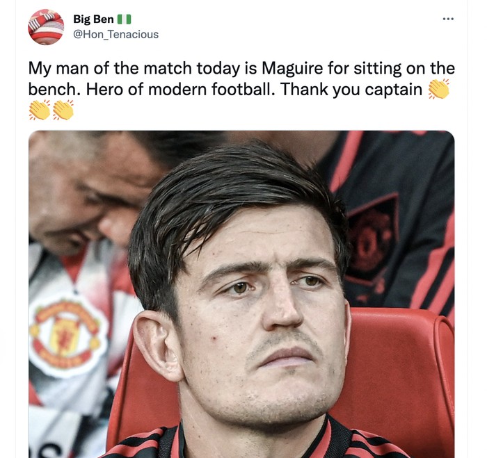 "Man of The Match bagiku adalah Maguire duduk di bangku cadangan. Pahlawan sepakbola modern. Terima kasih kapten," canda akun ini. Foto: Twitter