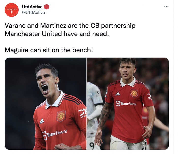 Duet Varane dan Martinez semalam memang impresif dan itulah yang dibutuhkan MU. "Maguire duduk saja di bangku cadangan," cetus akun ini. Foto: Twitter