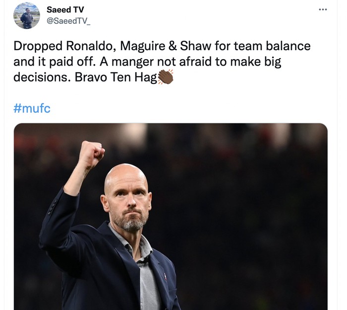 Erik Ten Hag pun dipuji karena berani membuat keputusan besar dengan mencadangkan Ronaldo dan Maguire melawan musuh bebuyutan Liverpool. Foto: Twitter