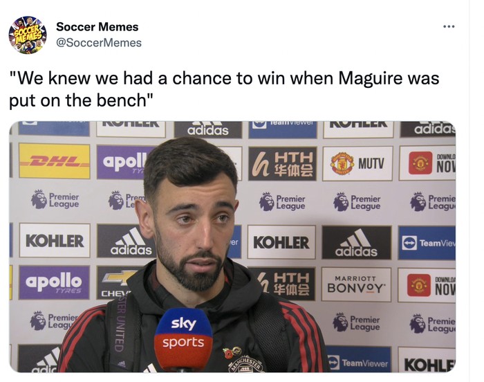 Meme Bruno Fernandes bilang bahwa MU lebih punya kesempatan menang kalau Maguire di bangku cadangan. Foto: Twitter