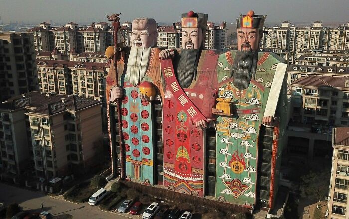 Ini adalah Hotel Tianzi di Provinsi Hebei, China. Gedung hotel ini dibentuk menyerupai tiga dewa China yang melambangkan kehidupan bahagia. Foto: Reddit via Bored Panda