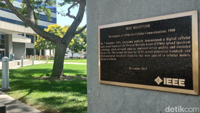 Prasasti IEEE di halaman kantor Qualcomm untuk mengenang sejarah lahirnya Code Division Multiple Access (CDMA) pada 7 November 1989. CDMA adalahΒ teknologi yang jadi cikal bakal telepon seluler. Foto: Fitraya Ramadhanny/detikcom