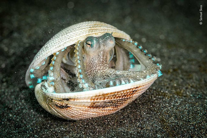 Β Foto: Wildlife Photographer of the YearΒ Samuel Sloss sedang melakukan muck diving, yang melibatkan gerakan perlahan di sepanjang pasir vulkanik Selat Lembeh, Indonesia, untuk melihat satwa liar ketika dia melihat gurita ini bersembunyi di dalam cangkang.Β