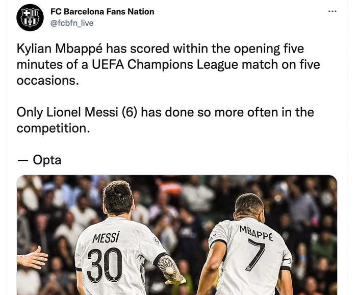 Sedangkan Mbappe sering mencetak gol di menit awal Liga Champions, hanya bisa disamai Messi. Foto: Twitter