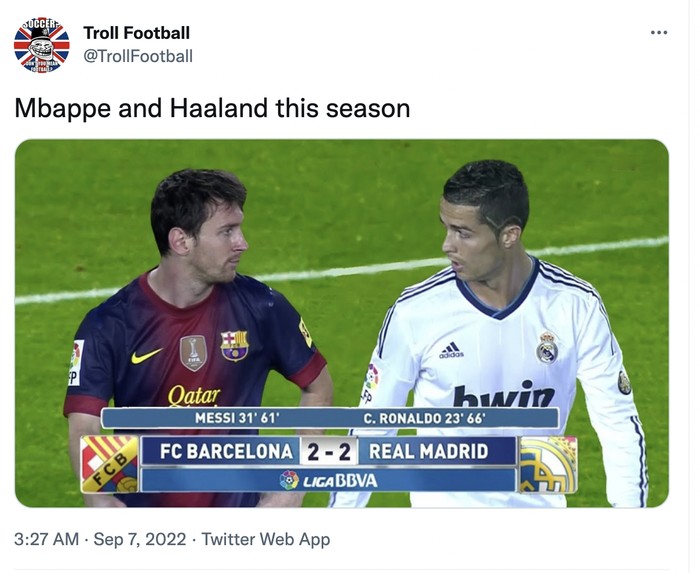 Semalam, baik Erling Haaland maupun Kylian Mbappe mencetak dua gol untuk timnya masing-masing di laga Liga Champions. Maka mungkin sudah saatnya debat siapa lebih baik antara Ronaldo dan Messi mulai dilupakan. Foto: Twitter