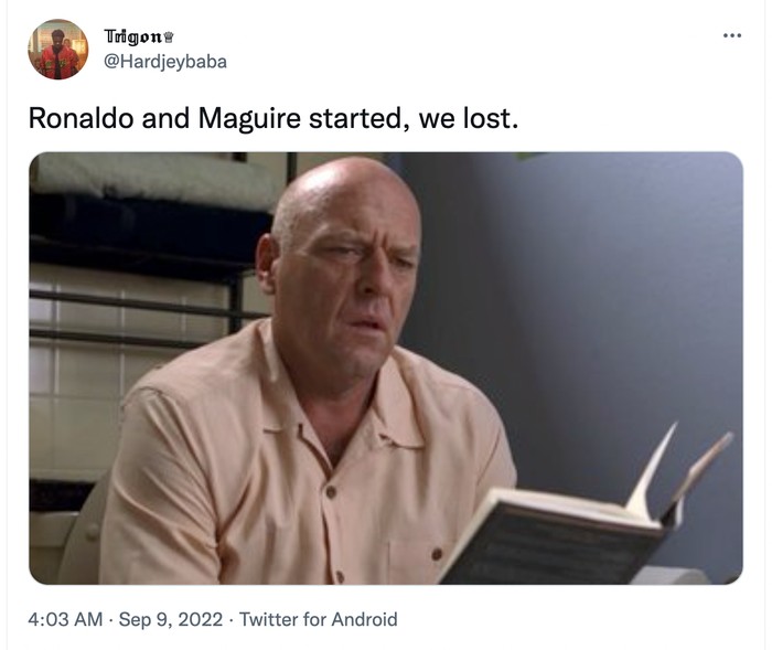 Netizen ini menyebut bahwa Ronaldo dan Maguire mungkin sudah tahu mereka akan kembali ke bangku cadangan di pertandingan berikutnya. Foto: Twitter