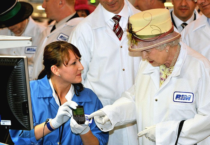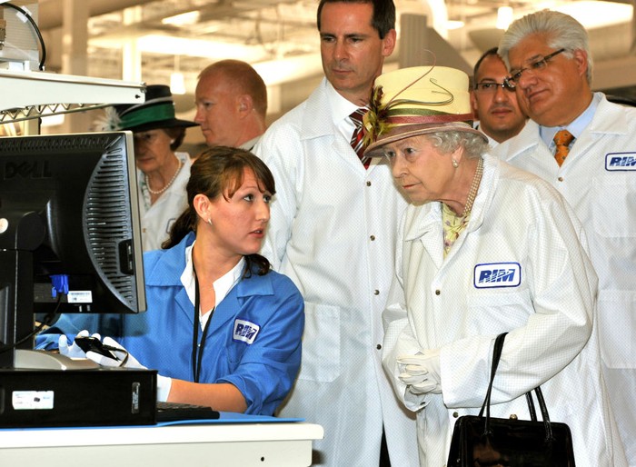 Dalam kunjungannya ke Kanada pada tahun 2010, Ratu Elizabeth II mengunjungi pabrik BlackBerry yang berlokasi di Waterloo. Kala itu, BlackBerry masih bernama Research in Motion (RIM). Foto: Getty Images