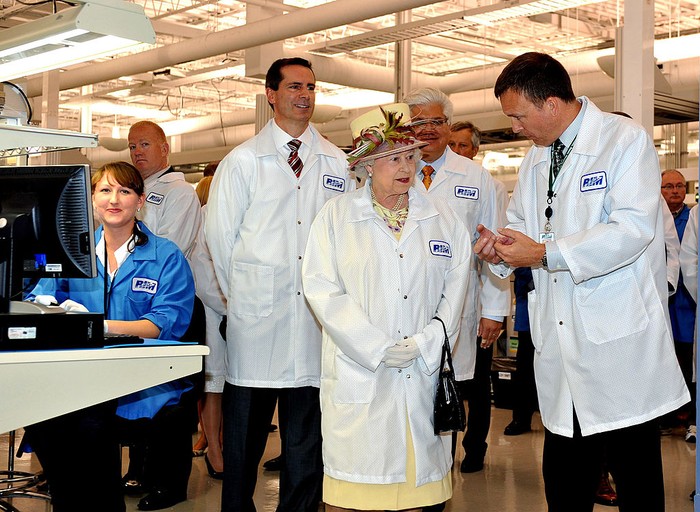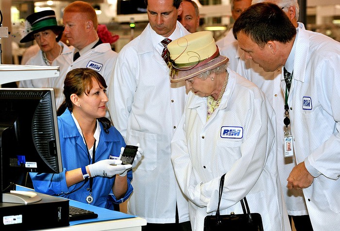 Ratu Elizabeth II mendengarkan penjelasan dari Gareth Hughes yang saat itu adalah Β Director of Manufacturing RIM. Foto: Getty Images
