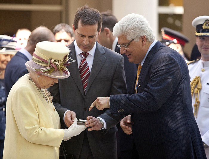 Co CEO RIM saat itu, Mike Lazaridis, menjelaskan fitur di BlackBerrt bersama walikota Ontario, Dalton McGunty. Sang ratu memang dikenal senang mengikuti dan mengimpelentasikan perkembangan pesat teknologi. Foto: Getty Images