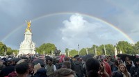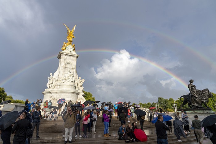 Pada 9 September 2022, setelah Istana Buckingham secara resmi mengumumkan Ratu Elizabeth II wafat di usia 96 tahun di kediamannya di Balmoral, Skotlandia, tampak langit dihiasi pelangi. Foto: AP/Frank Augstein