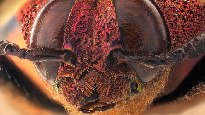 Jepretan makro ini memperlihatkan mata majemuk berwarna kemerahan dari kumbang permata.