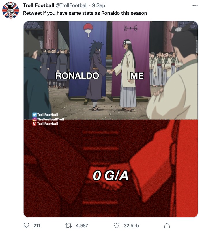 Cristiano Ronaldo yang berseragam MU masih belum mencetak gol maupun assist, kalah telak dari Lewandowski. Foto: Twitter