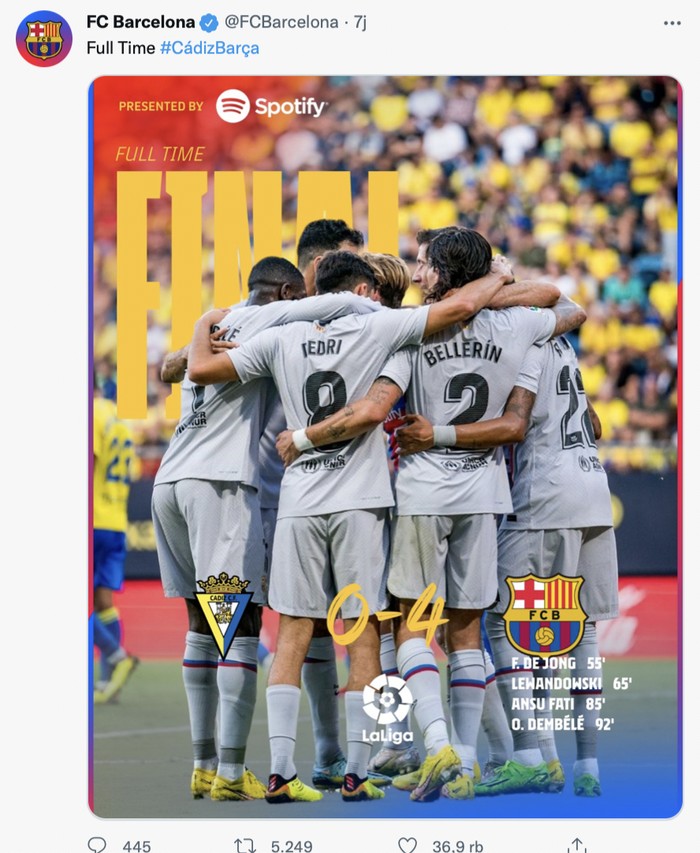 Visca Barca berkumandang di linimasa pada pagi ini, penanda fans Barcelona girang akan kemenangan tim Catalan vs Cardiz dengan skor akhir 4-0. Foto: Twitter