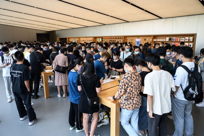 iPhone 14 dijual perdana pada 16 September hari ini di berbagai negara, termasuk China. Ini penampakan di depan Apple Store di Hangzhou. Foto: Getty Images