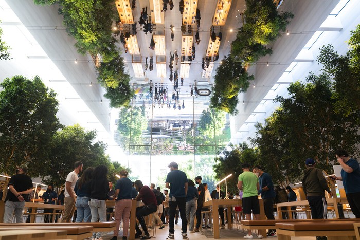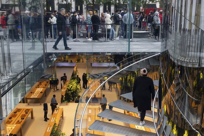 Apple Store begitu buka langsung ramai dengan pengunjung yang sebelumnya sudah mengantre. Foto: Associated Press