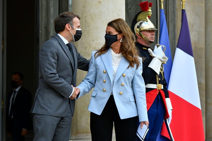 Ia juga tetap aktif di urusan kemanusiaan dunia ataupun perempuan. Ini saat berkunjung ke Perancis dan bertemu dengan Presiden Emanuel Macron. Foto: Getty Images